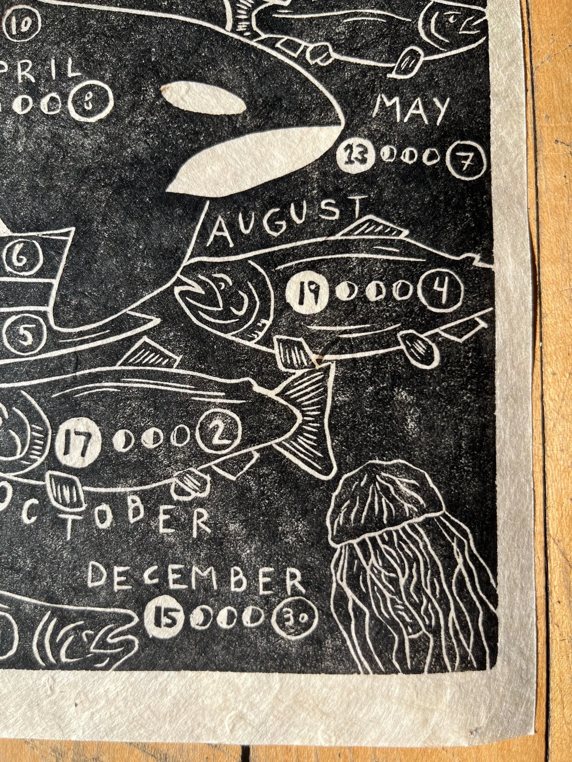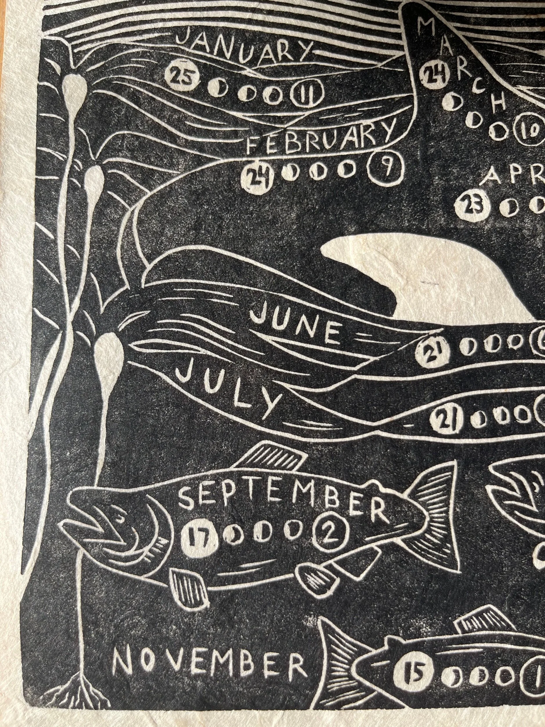 The design was sketched on paper, transferred to a linoleum block, hand carved and printed using my press. The carving block is 8x10 inches, printed on 8.5 x 11 inch handmade Lokta paper, using Caligo Cranfield black ink.
